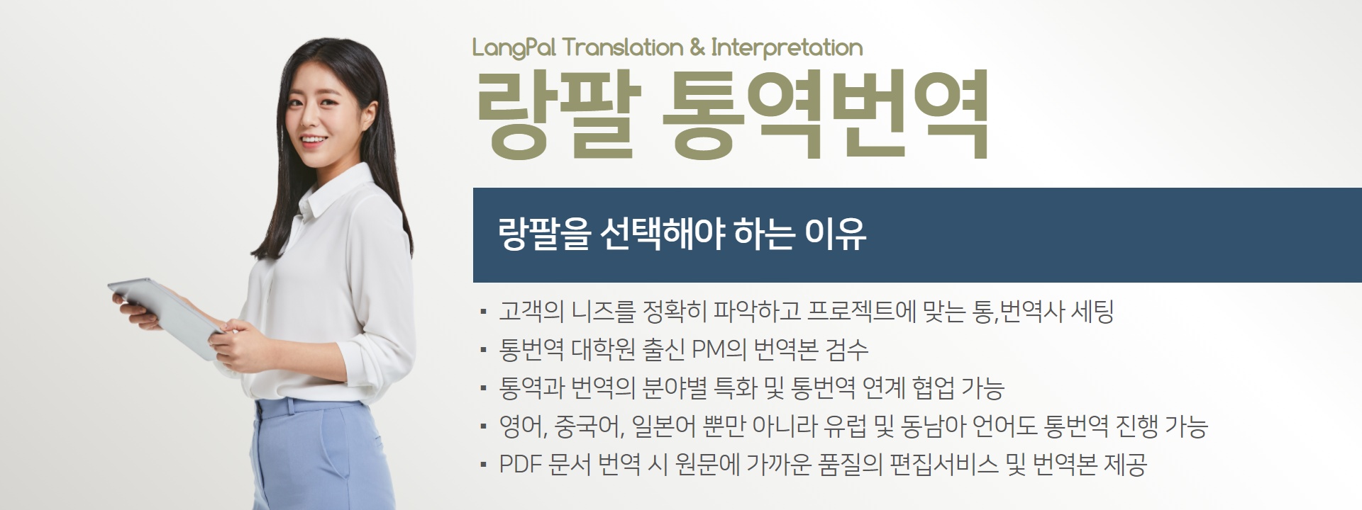 LangPal 랑팔은 다년간의 정부기관 및 기업의 통번역 프로젝트 진행 경험과 노하우를 바탕으로 시작되었습니다. 급변하는 기술의 진보와 진화에 따라 글로벌 비즈니스 환경은 변화하고 매일 새로운 창조와 혁신이 이루어지고 있습니다. 그러나 변하지 않는 한가지는 바로 소통입니다.
